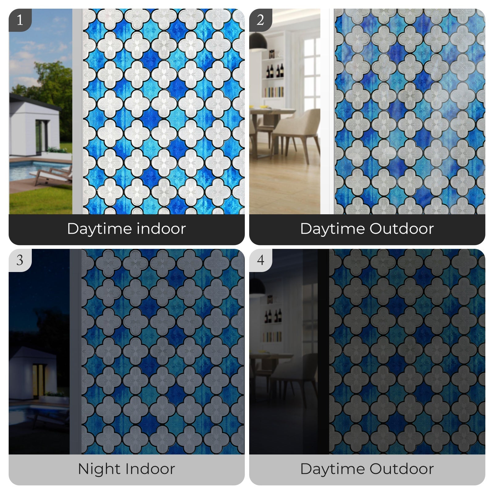 At night, when indoor lights are on and it is dark outside, faint silhouettes may be visible. This is normal for all light-transmitting privacy films.