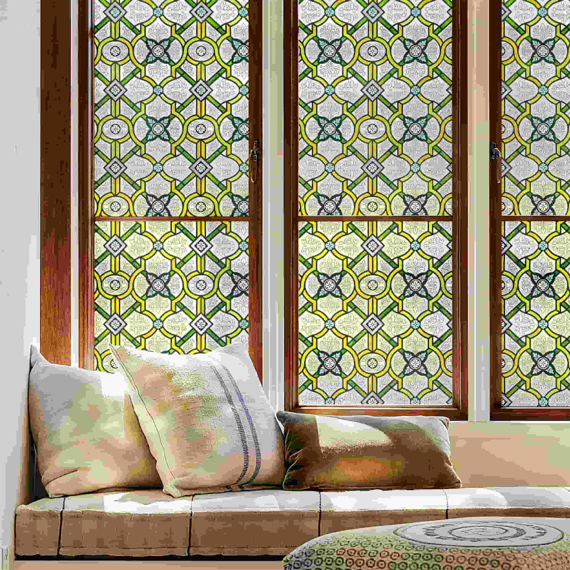- Holy Lattice — This elegant window film draws inspiration from sacred interwoven lattices, delicately resembling stained glass windows, bringing a tranquil yet solemn play of light and shadow into your space. The classic and dynamic pattern ensures privacy while infusing a touch of grace and divinity, perfect for creating a soothing and tasteful atmosphere.
