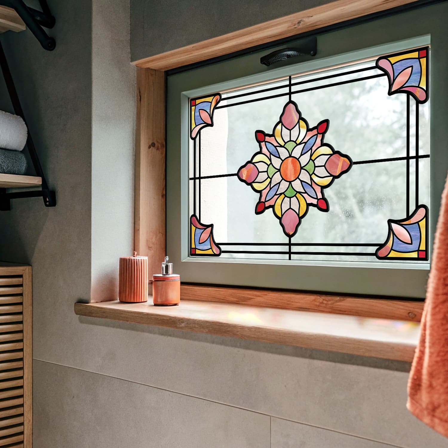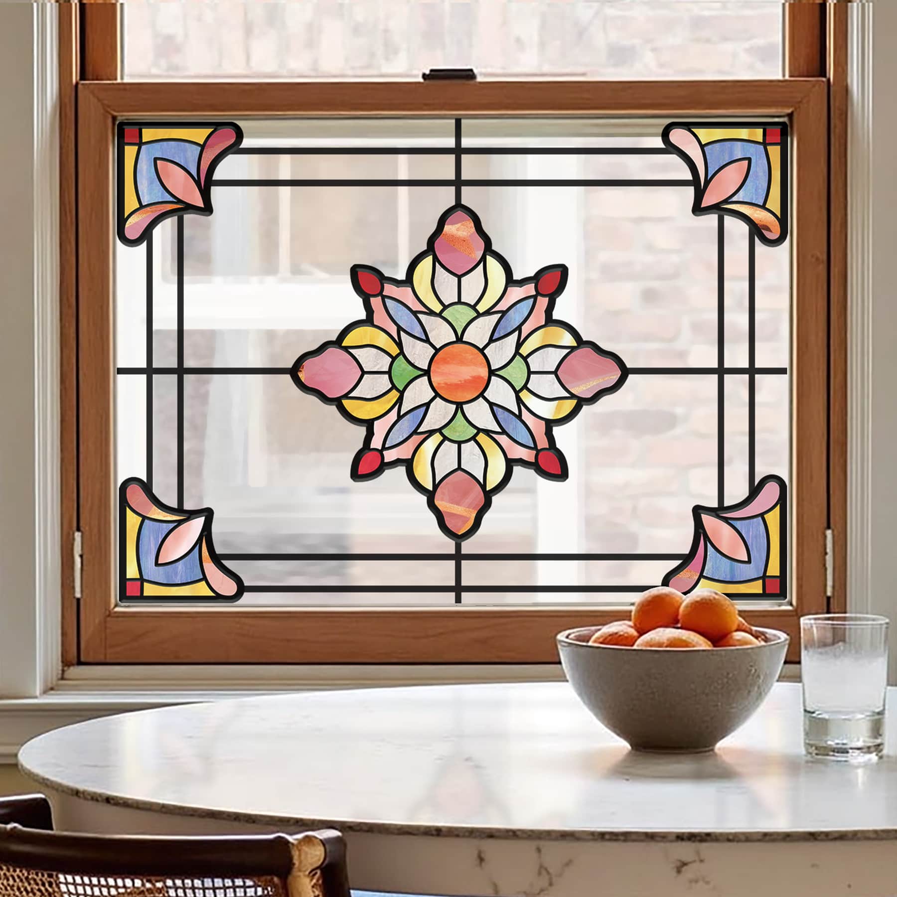 - Elegant Design: Transform your windows with our exquisite window decals. At the center of the motif is a prominent floral design, featuring petals in white, pink, green, and yellow, with an orange center. This color palette evokes the beauty of flowers in nature, creating a warm and delightful feeling.